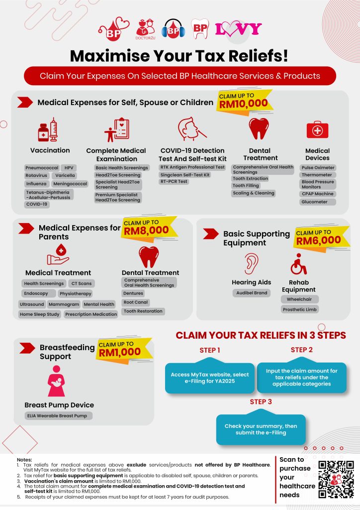 Enjoy tax reliefs on a range of health services and products by BP Healthcare! Claim your expenses on health screenings, vaccinations, COVID-19 tests, and more when you file your income tax!